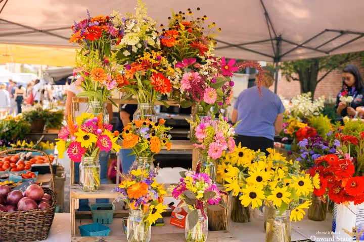 Fresh flowers for sale at the Downtown State College Farmers Market, photo courtesy of Onward State